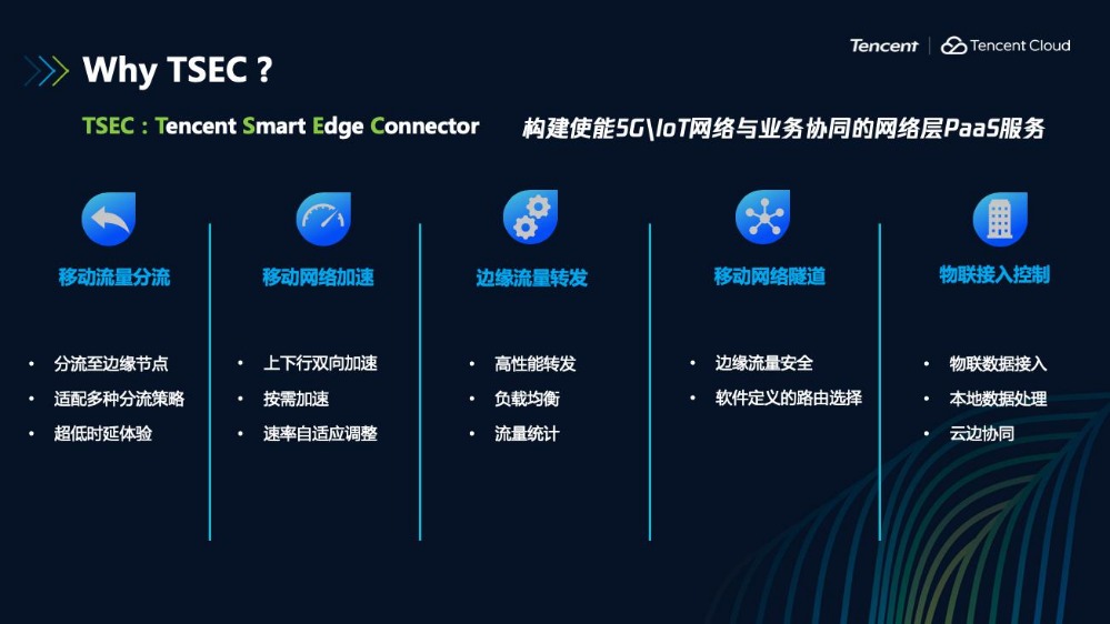 騰訊TSEC致力于構(gòu)建使能5G/IoT網(wǎng)絡(luò)與業(yè)務(wù)協(xié)同的網(wǎng)絡(luò)層PaaS服務(wù),具備移動(dòng)流量分流、移動(dòng)網(wǎng)絡(luò)加速、邊緣流量轉(zhuǎn)發(fā)、移動(dòng)網(wǎng)絡(luò)隧道、物聯(lián)接入控制等核心功能。作為5G網(wǎng)絡(luò)與業(yè)務(wù)的橋梁,TSEC豐富的移動(dòng)組件可以連接移動(dòng)用戶、運(yùn)營(yíng)商5G網(wǎng)絡(luò)和應(yīng)用,為高價(jià)值用戶和業(yè)務(wù)提供可自定義的、高質(zhì)量的、差異化的邊緣計(jì)算網(wǎng)絡(luò)服務(wù),實(shí)現(xiàn)應(yīng)用在云、邊、端的友好協(xié)同。