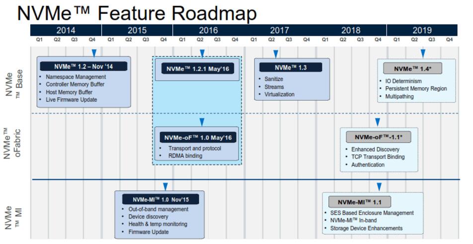 第一個NVMe規(guī)范逐漸增加了更新的功能——1.2版本中的實時固件更新和1.3版本中的清理功能已經(jīng)在SCSI和SATA中很常見了。明年年中推出NVMe 1.4版本將增加IO Determinism功能,以確?缇W(wǎng)絡(luò)和存儲的緊密且一致的延遲。同時,新增的管理規(guī)范也提供了管理設(shè)備機箱的能力。